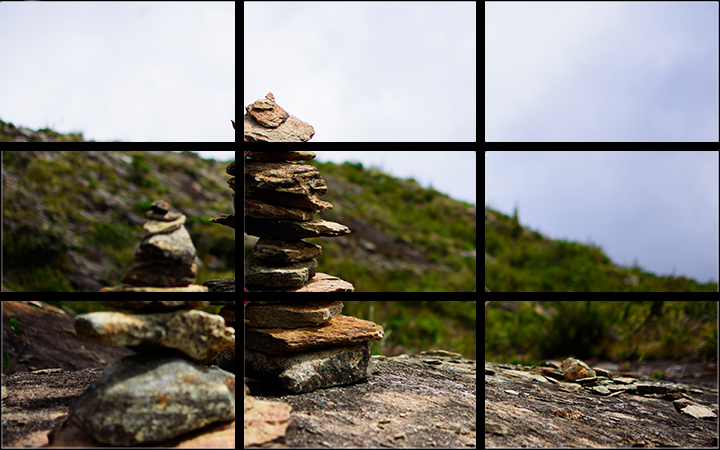 Neste ‘jogo da velha’ virtual, as quatro esquinas do quadrado central revelam quatro pontos de interesse da imagem, ou seja, zonas que devemos posicionar os elementos mais atraentes a fotografar.